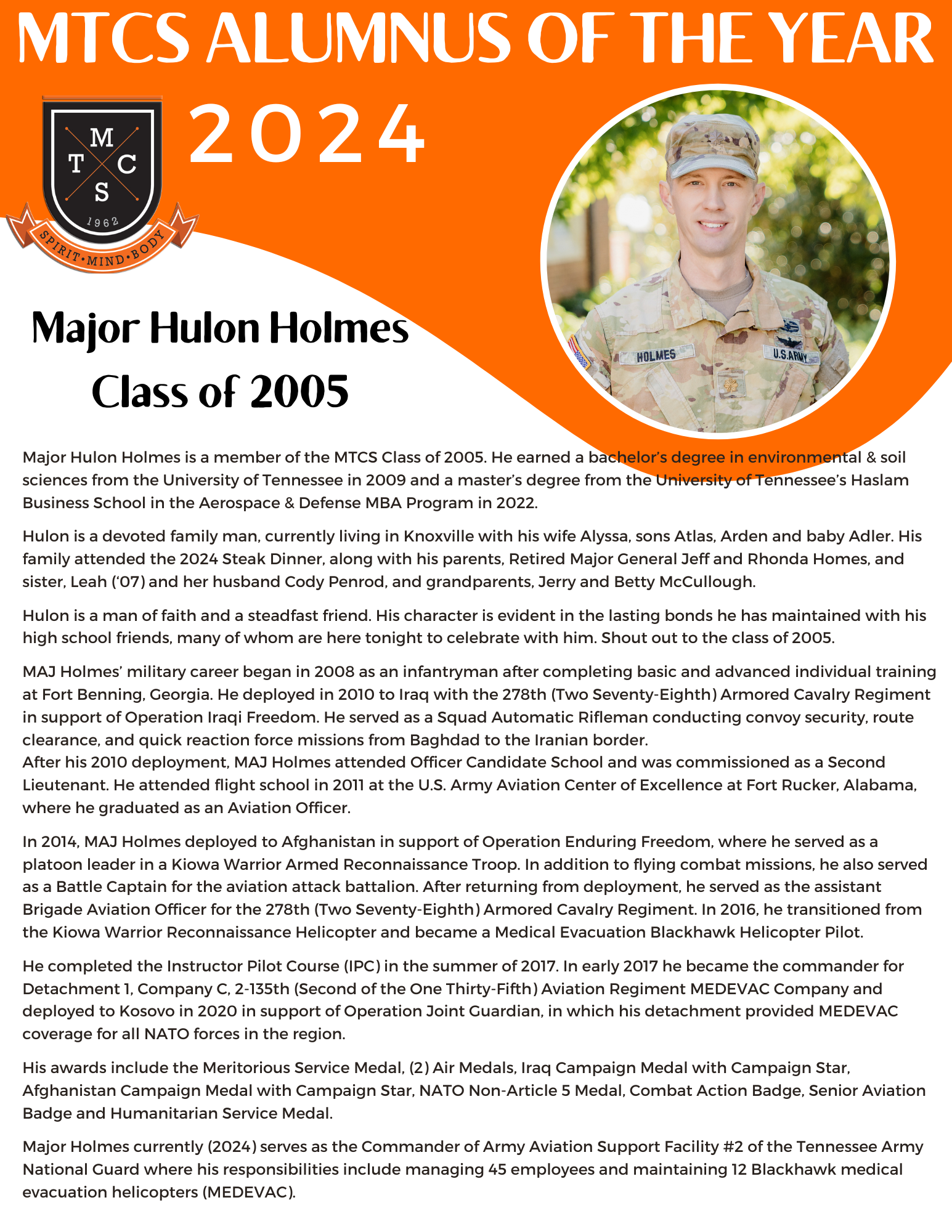 Beginning in 2016, the Alumnus of the Year is celebrated annually at the Steak Dinner in November. The Steak Dinner is the longest running fundraiser for MTCS, originally held in 1960 to raise funds to purchase property upon which to build the school. The Steak Dinner commemorates MTCS history and has become an event that has high alumni attendance.